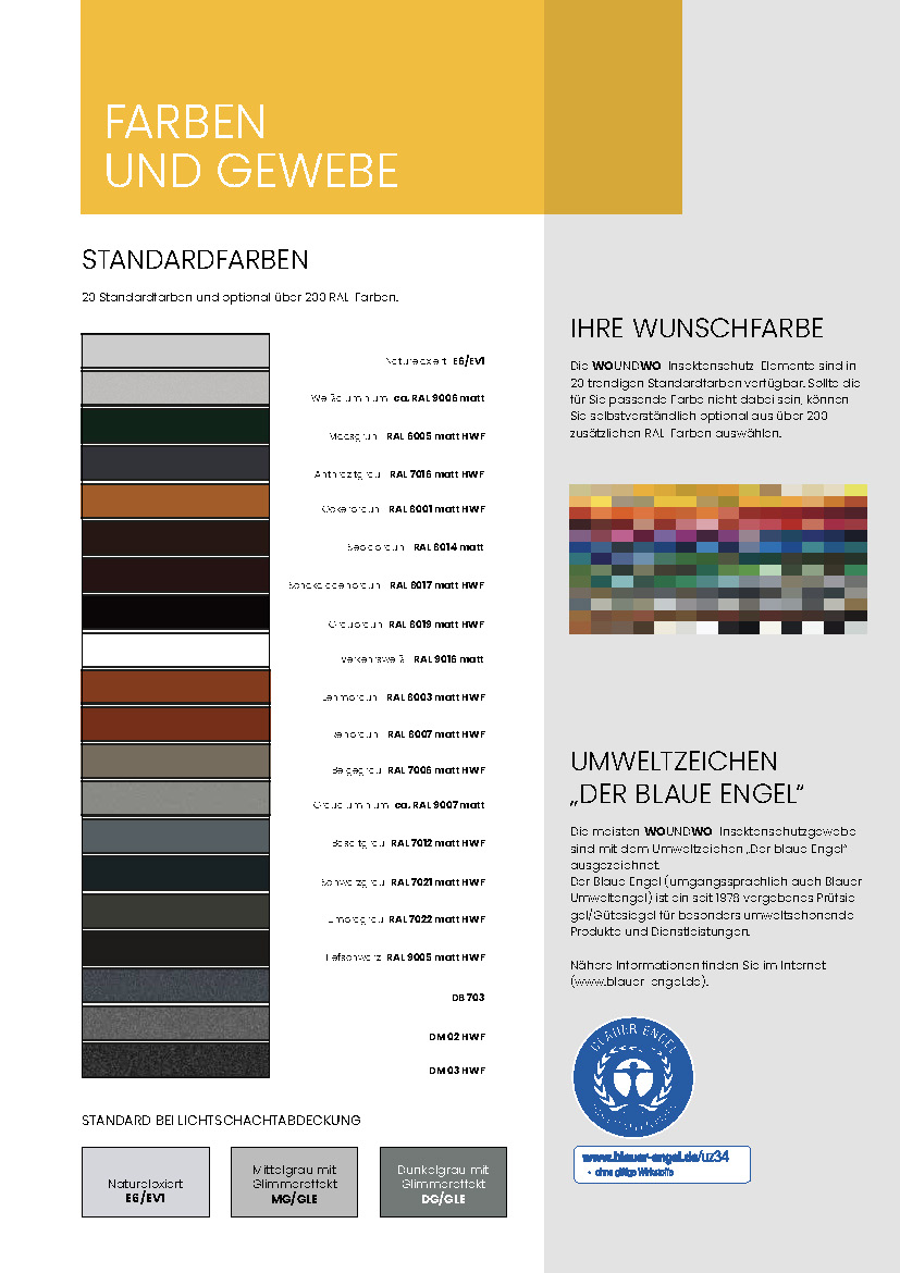 Damit sich Ihr Fliegengitter harmonisch in Fenster, Türen und Sonnenschutz einfügt, stehen 20 Standardfarben sowie optional über 200 RAL-Farben zur Verfügung.