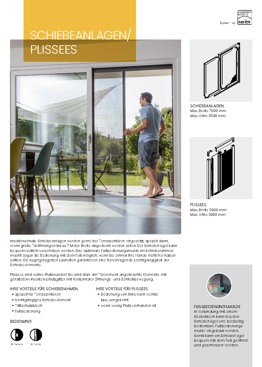 Kugelgelagerte Laufrollen sorgen für ruhige Bewegungen. Optional ist eine Fußbedienungsmulde integrierbar, wenn Sie beide Hände frei haben möchten. Besonders bei großflächigen Terrassentüren ist diese Lösung komfortabel und langlebig.